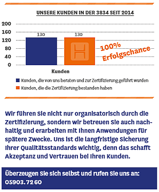 Die ISO 3834 legt die Anforderungen an einen Schweißfachbetrieb fest und regelt die Grundsätze zur Qualitätssicherung geschweißter Produkte. Hersteller von schmelzgeschweißten Bauteilen und Konstruktionen sichern sich mit der Zertifizierung nach der international anerkannten Norm ihre weltweite Wettbewerbsfähigkeit.